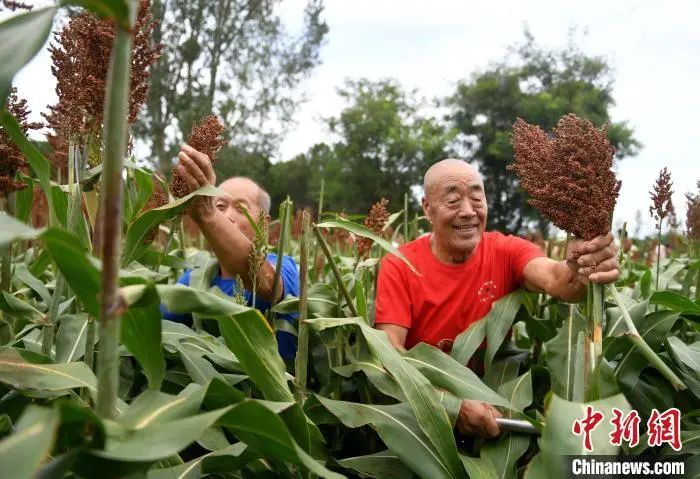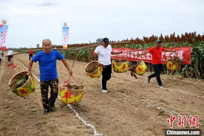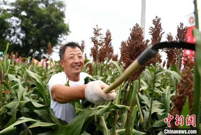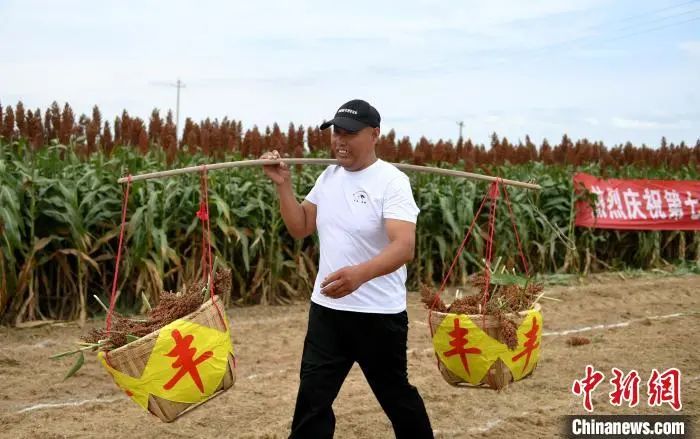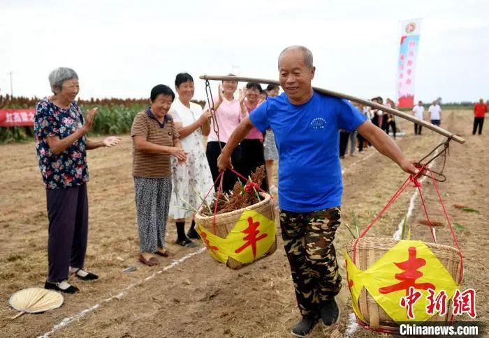 近日,河北省衡水市阜城县10万亩酿酒红高粱进入成熟期。9月2日,在阜城县崔家庙镇小息庄村的高粱地里,村民聚到一起举办了一场迎高粱丰收农事趣味运动会,把农活中最常见的挑、扛、割等动作变为运动比拼,感受丰收喜悦。近年来,阜城县积极改变传统种植方式,转型种植高产抗旱的酿酒专用糯高粱“冀酿2号”,成为富民增收的重要产业之一。图为村民正在进行比赛。