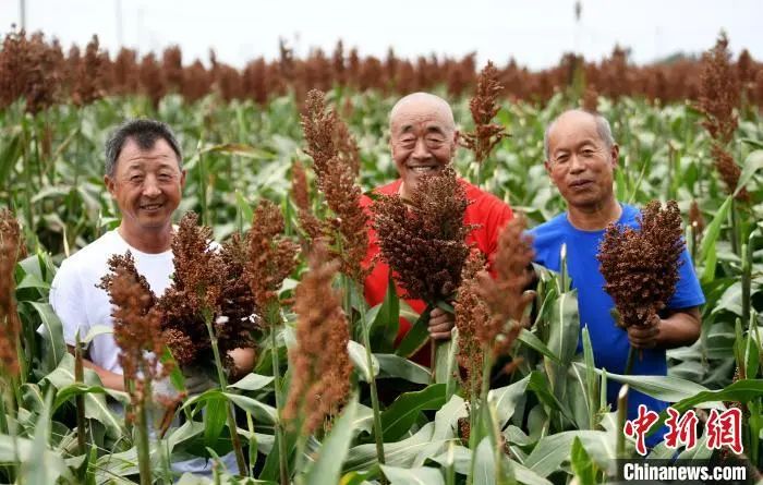 图为村民展示收割的酿酒红高粱穗。