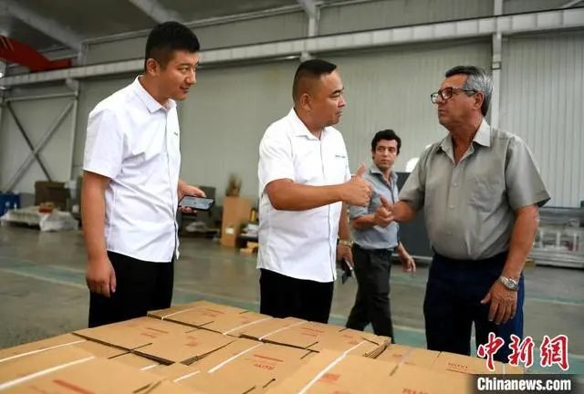 图为巴西客商在河北省衡水市阜城县码头镇一包装机械制造企业与负责人交流。