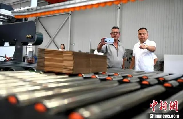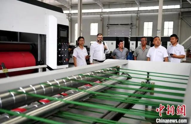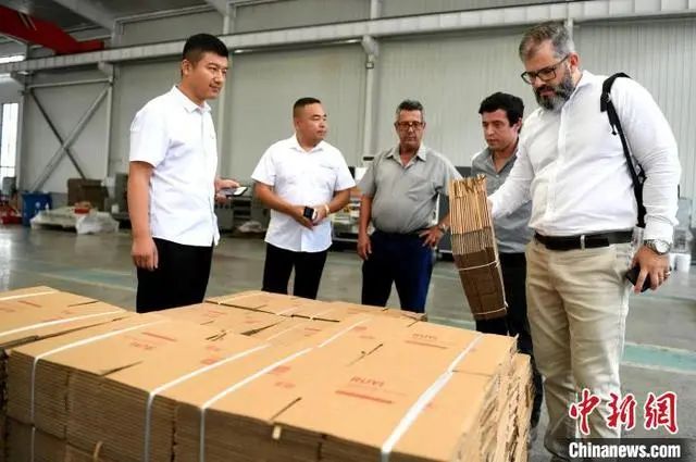 图为巴西客商在河北省衡水市阜城县码头镇一包装机械制造企业查看生产的纸箱。