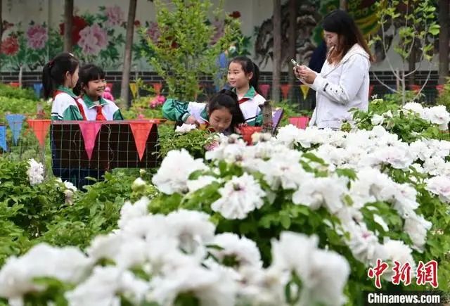 4月29日,河北省衡水市阜城县小学师生在刘老人村欣赏牡丹花。中新社记者 翟羽佳 摄